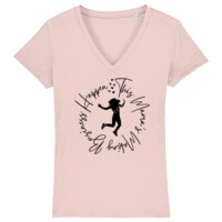 Set-in sleeve. Self-fabric at neck collar. Inside back neck tape in self-fabric. Sleeve hem and bottom hem with narrow double topstitch. Women's, medium fit, short sleeve, v-neck. 100% organic ringspun combed cotton. Single Jersey. Fabric washed. Vegan certified. Fairwear Foundation certified. Oeko-Tex certified.